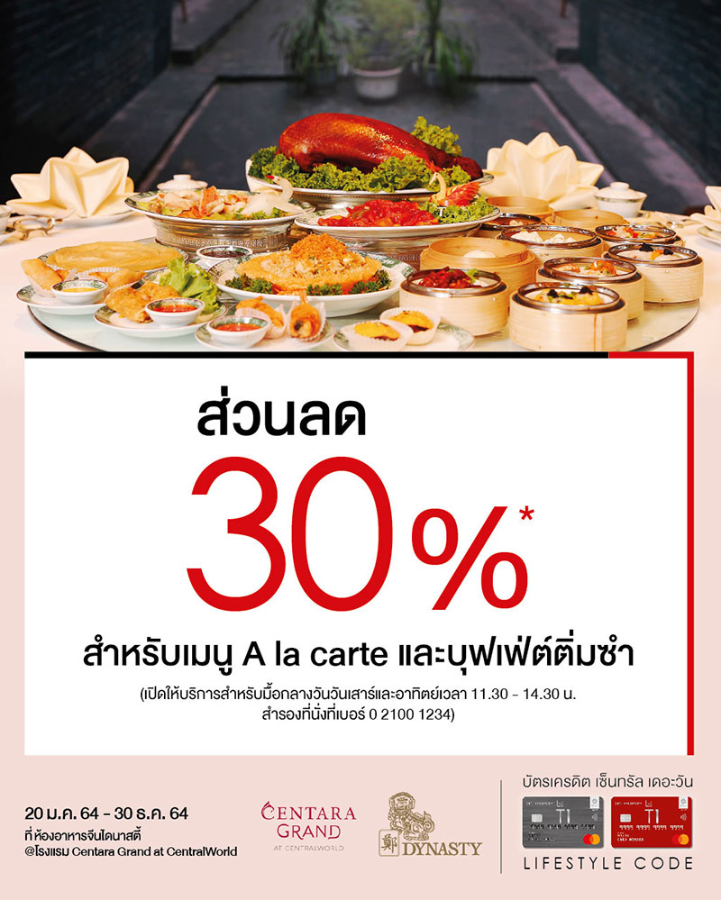 ส่วนลด 30%* สำหรับเมนู A la carte และบุฟเฟ่ต์ติ่มซำ มื้อกลางวัน (วันเสาร์และวันอาทิตย์) เวลา 11.30-14.30 น.