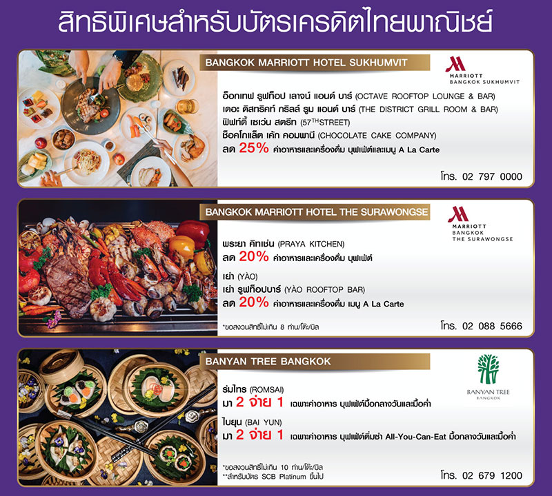 - บัตรเครดิตบางใบอาจจำกัดจำนวนผู้เข้ารับประทานต่อการใช้บัตร 1 ครั้ง ผู้ใช้ควรติดต่อสอบถามโดยตรงกับทางโรงแรมที่ร่วมรายการ