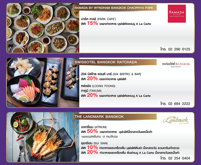รับส่วนลดสำหรับค่าอาหารแบบ A la carte เครื่องดื่มที่มีแอลกอฮอล์และไม่มีแอลกอฮอล์