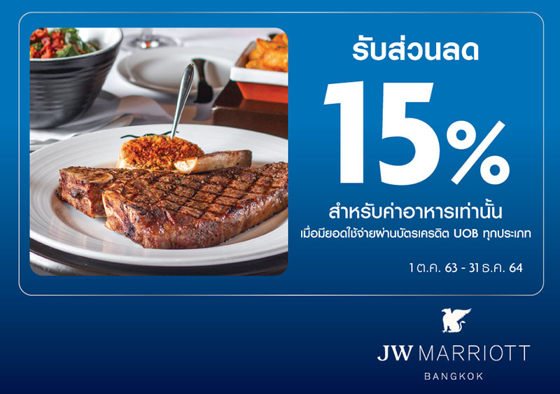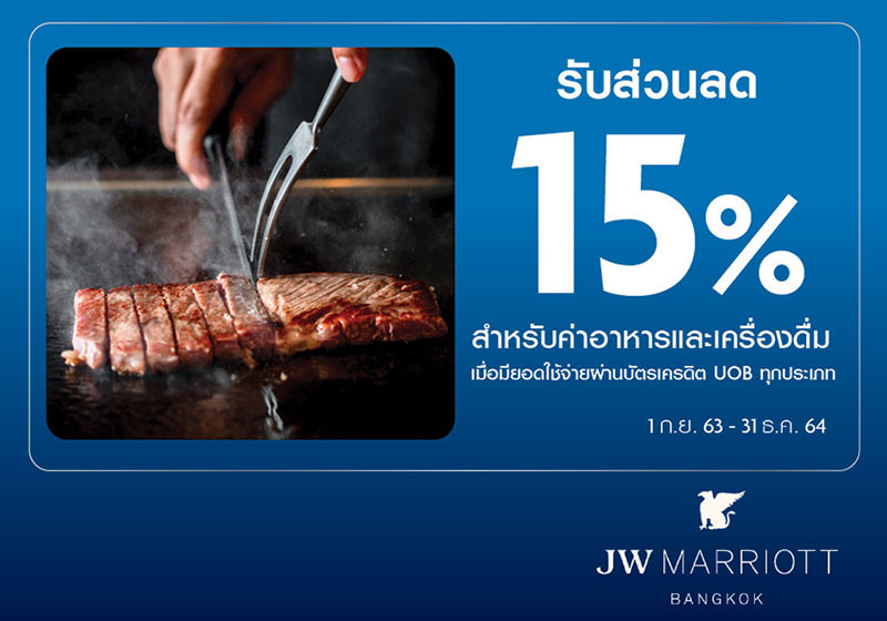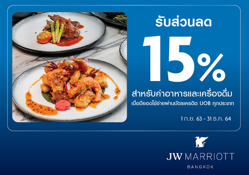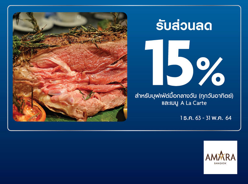 ส่วนลด 15%* สำหรับค่าอาหาร บุฟเฟ่ต์มื้อกลางวัน มื้อค่ำและซันเดย์บรันซ์ รวมเมนูอะลาคาร์ทและเครื่องดื่ม