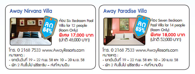 (ราคาใน www.AwayResorts.com) - ยกเว้นการเข้าพักระหว่าง 23 ธ.ค. 57 - 10 ม.ค. 58, 19 - 22 ก.พ. 58, 10 - 20 เม.ย. 58 วันหยุดยาว, วันหยุดนักขัตฤกษ์