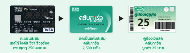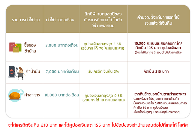 ตัวอย่าง: ขอยกตัวอย่างกรณีบัตรเครดิต Tesco Lotus ต่อนะคะ บางคนอาจคิดว่าได้ประโยชน์แค่ที่ Tesco Lotus แต่ความจริงถ้าเอาไปใช้รูดนอกห้าง Tesco Lotus บัตรก็ยังมีโปรโมชั่นลดราคาตามร้านค้าชั้นนำต่างๆ เช่นกันค่ะ โดยเมื่อใช้จ่ายที่ร้านค้าทั่วไปทั่วโลกทุกๆ 20 บาทจะได้รับ 1 คะแนนสะสมเทสโก้ โลตัส วีซ่า รีวอร์ดส เทียบเท่าแต้มคลับการ์ด 10 แต้ม หรือคิดเป็นมูลค่าของผลตอบแทนในรูปแบบของคูปองเงินสดที่ 0.5% ของมูลค่ารายการใช้จ่ายเลยค่ะ (