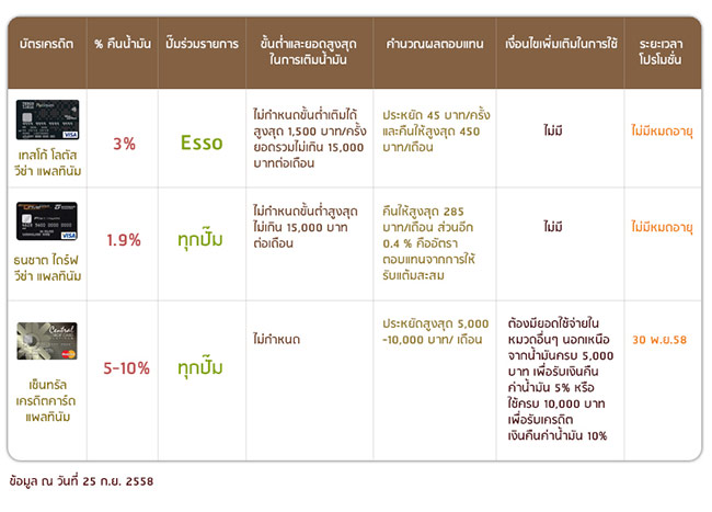 เทคนิคต่อมาคือให้เลือกบัตรที่ให้ผลประโยชน์ที่โดนใจเราค่ะ โดยทั่วไปบัตรเครดิตจะมีรูปแบบการคืนผลประโยชน์ 2 แบบ คือแบบเครดิตเงินคืน (Cash Back) และแบบคะแนนสะสม (Reward Points) หลักการคร่าวๆ ของ 2 เรื่องนี้ คือ (ก) Cash Back มักจะคืนผลประโยชน์ให้ประมาณ 0.5 - 2% โดยจะคืนเงินเป็น % ให้จากยอดการใช้จ่ายผ่านบัตร ซึ่งบางใบก็คืนให้จากทุกยอดการใช้จ่าย และบางใบก็อาจจะมีเงื่อนไขในการคืนเงิน เช่น คืนเฉพาะค่าใช้จ่ายในหมวดที่กำหนดเช่น คืนให้ 1% เฉพาะยอดใช้จ่ายในหมวดสถานีบริการน้ำมัน ส่วนยอดใช้จ่ายที่ไม่เข้าพวกจะคืนแค่ 0.5% และ (ข) Reward Points จะให้ผลประโยชน์ในรูปของการสะสมคะแนน โดยส่วนใหญ่ 1 คะแนนจะมาจากทุกยอดการใช้จ่ายผ่านบัตร 20 - 25 บาท โดยสามารถเลือกนำคะแนนไปแลกของ บัตรกำนัล หรือจะแลกเป็นเครดิตเงินคืนก็ได้เช่นกันค่ะ ตัวอย่างนะคะ ถ้าบ้านเราห่างจากที่ทำงาน 25 กม. ต้องขับรถแบบนี้ทุกวัน เติมน้ำมันเดือนละหลายครั้ง เราขอยกตัวอย่างประโยชน์ที่จะได้จากบัตรเครดิตกรณีเติมน้ำมันมาให้ดูเล่นๆ ดังนี้ค่ะ