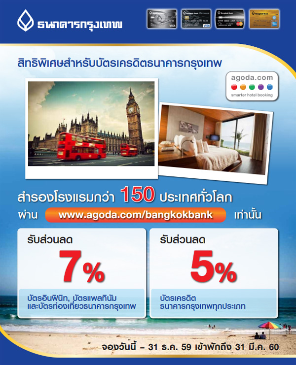 - รับส่วนลดสูงสุด 7% เมื่อจองโรงแรมกว่า 150 ประเทศทั่วโลก ผ่าน www.agoda.com/bangkokbank