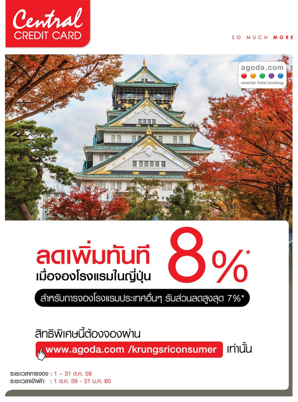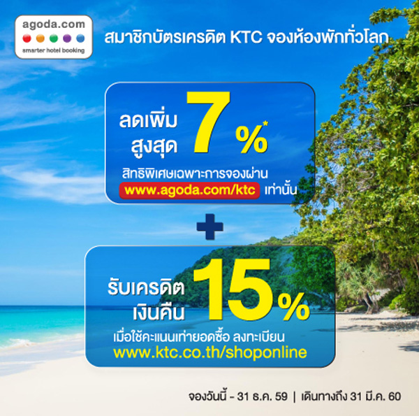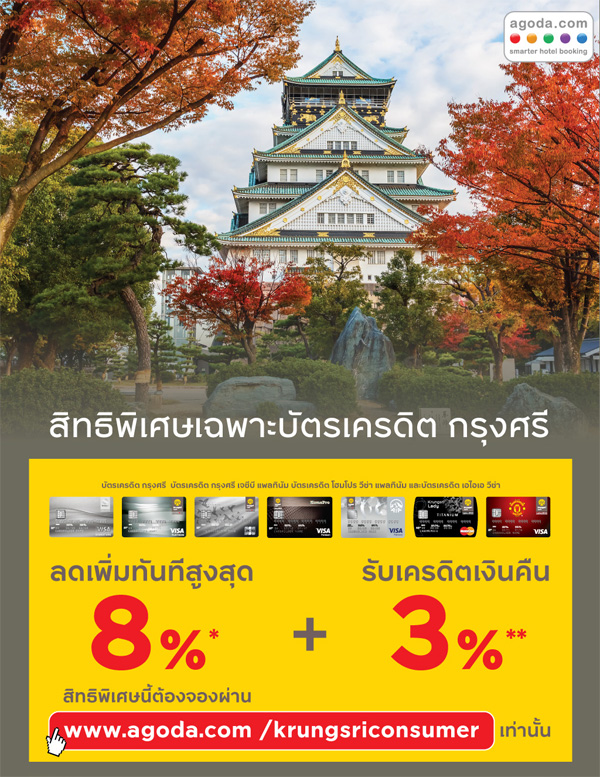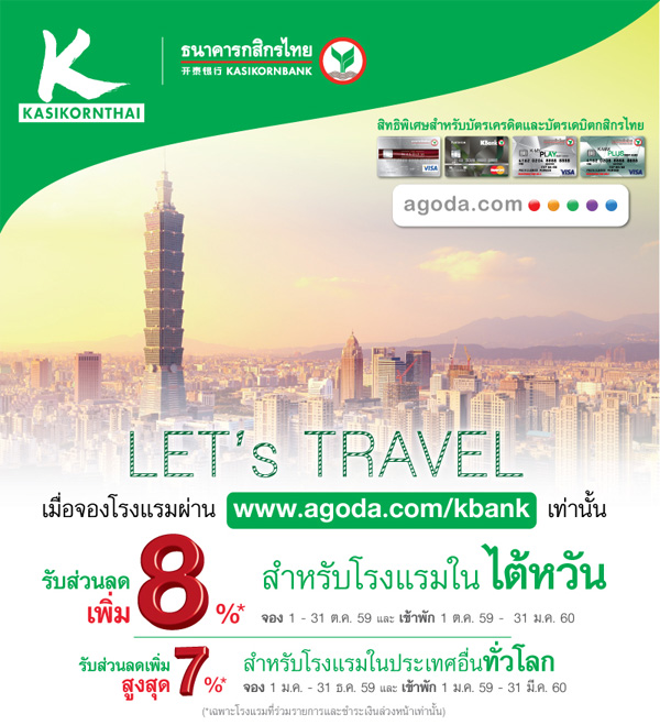 - รับส่วนลดเพิ่มสูงสุด 8% เมื่อจองโรงแรมผ่าน www.agoda.com/kbank