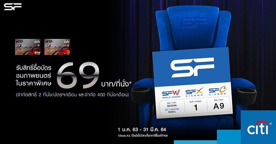 รายละเอียดโปรโมชั่น : เมื่อซื้อบัตรชมภาพยนตร์ ประเภทที่นั่ง Deluxe Seat 1 ใบ โดยใช้บัตรเครดิตซิตี้ ซิมพลิซิตี้ รับฟรีบัตรชมภาพยนตร์ที่นั่ง Deluxe อีก 1 ใบ ที่โรงภาพยนตร์ในเครือ เอส เอฟ ทุกสาขาทั่วประเทศ
