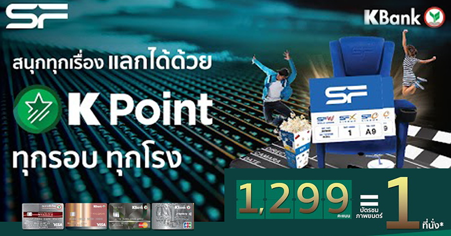 โปรโมชั่น : สิทธิพิเศษสำหรับสมาชิก บัตรเครดิตกสิกรไทยทุกประเภท ยกเว้นบัตรเครดิตไทเทเนียมกสิกรไทย บัตรเครดิตเพื่อธุรกิจและบัตรเครดิตนิติบุคคลทุกประเภท แลกรับคะแนน K Bank Reward Point 1,299 คะแนน รับบัตรชมภาพยนตร์ประเภท Deluxe Seat 1 ที่นั่ง ฟรี