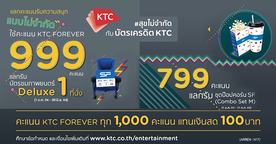 เงื่อนไข ต่อที่ 1 ใช้คะแนน KTC Forever Rewords 999 คะแนน แลกรับบัตรชมภาพยนตร์ Deluxe 1 ที่นั่ง