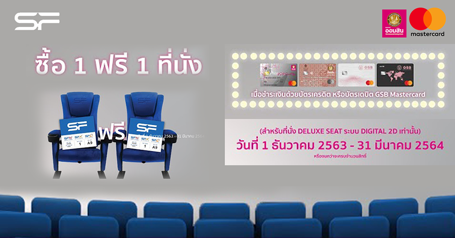 โปรโมชั่น : ซื้อบัตรชมภาพยนตร์ 1 ฟรี 1 ที่นั่ง เมื่อชำระค่าบัตรชมภาพยนตร์ผ่านบัตรเครดิตหรือบัตรเดบิตธนาคารออมสิน