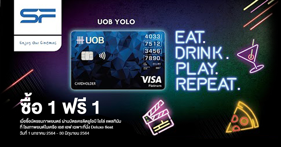 รายละเอียดโปรโมชั่น : เมื่อซื้อบัตรชมภาพยนตร์ผ่านบัตรเครดิตธนาคารยูโอบี โยโล่ แพลตินัม ที่ออกในประเทศไทยประเภท Deluxe ในระบบปกติ จำนวน 1 ที่นั่ง รับฟรีอีก 1 ที่นั่ง