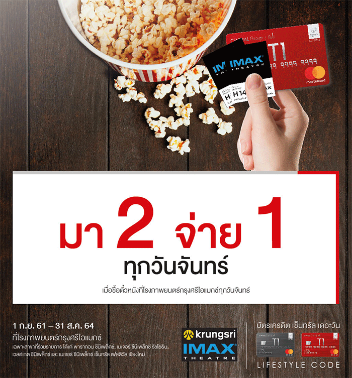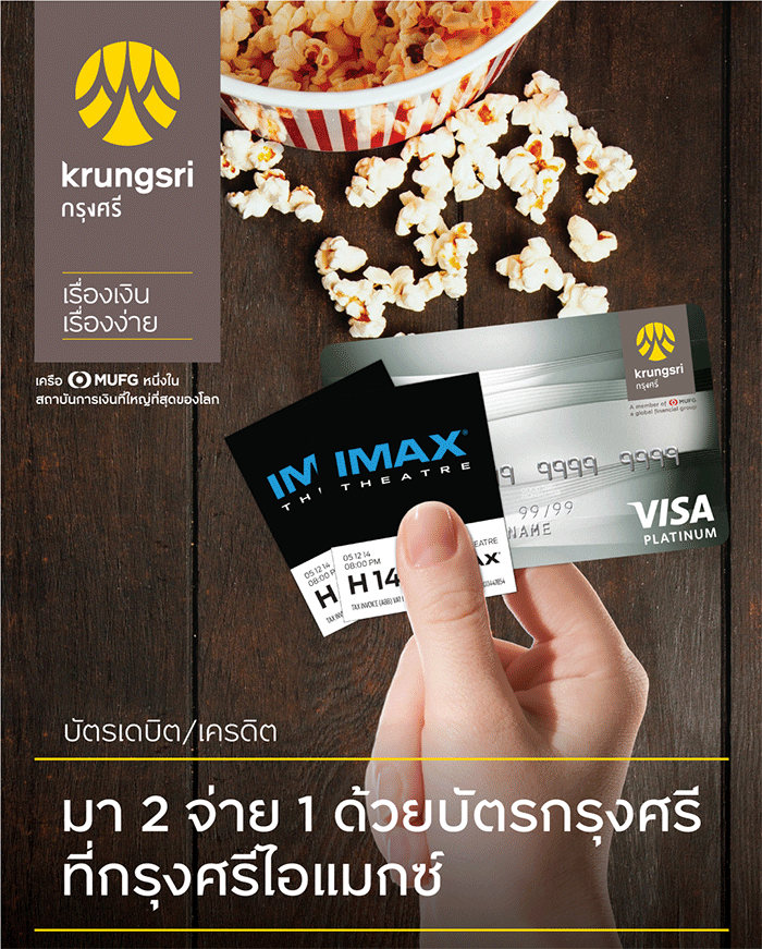 รายละเอียดโปรโมชั่น : ลูกค้าบัตรเดบิต / เครดิตกรุงศรี มีเฮ! ซื้อบัตรชมภาพยนตร์ IMAX 1 แถม 1 ทุกวันจันทร์!