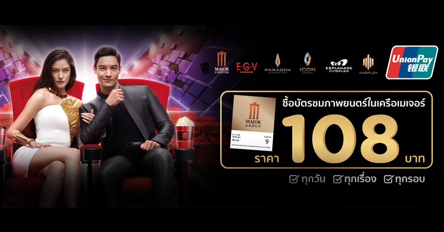 รายละเอียดโปรโมชั่น 1 : บัตร KTC UNIONPAY ซื้อบัตรชมภาพยนตร์ในเครือเมเจอร์ ด้วยราคาสุดคุ้ม ในราคา 108 บาท ได้ทุกวัน ทุกเรื่อง ทุกรอบ เมื่อชำระด้วยบัตร KTC UNIONPAY ทุกประเภท