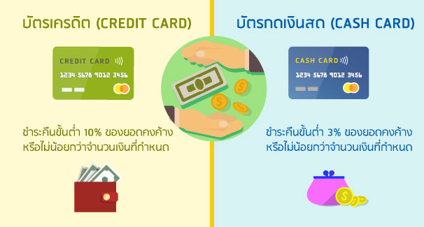 การชำระคืนที่ดีที่สุดสำหรับบัตรเครดิต คือ การจ่ายเต็มจำนวนภายในวันที่กำหนด เพราะเราจะไม่ต้องเสียดอกเบี้ยจากการใช้บัตรรูดซื้อของนั้นเลย แต่หากใช้บัตรกดเงินสดก็ขอแนะนำให้รีบจ่ายคืนแบบเต็มจำนวนให้เร็วที่สุดนะคะ เพราะดอกเบี้ยบัตรกดเงินสดนั้นคิดตั้งแต่วันที่เรากดใช้ หากชำระคืนเร็วจะทำให้เราเสียดอกเบี้ยน้อยลงค่ะ แต่หากใครไม่สามารถชำระเต็มจำนวนได้ก็สามารถเลือกชำระแบบจ่ายขั้นต่ำ ซึ่งบัตรเครดิตจะกำหนดให้ต้องชำระคืนขั้นต่ำ 10% ของยอดคงค้าง ส่วนบัตรกดเงินสดจะกำหนดให้ต้องชำระคืนขั้นต่ำ 3% ของยอดคงค้าง แต่ธนาคารหรือสถาบันการเงินอาจมีเงื่อนไขเพิ่มเติม เช่น จำนวนเงินชำระคืนขั้นต่ำต้องไม่น้อยกว่า 300, 500 หรือ 1,000 บาท เป็นต้น