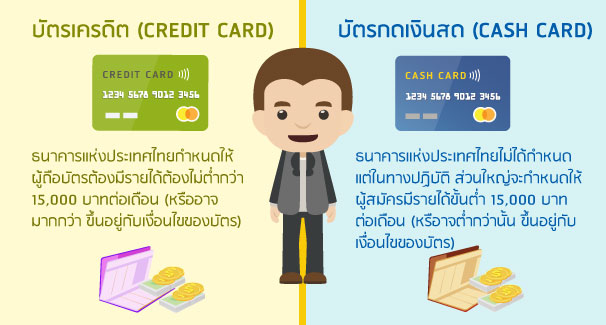 ส่วนบัตรกดเงินสดนั้นแม้ว่าจะไม่ได้กำหนดรายได้ขั้นต่ำไว้ชัดเจน แต่ธนาคารผู้ออกบัตรส่วนใหญ่ก็จะกำหนดให้ผู้สมัครบัตรต้องมีรายได้ขั้นต่ำ 15,000 บาทต่อเดือนเช่นกัน นอกจากนี้ผู้สมัครยังจำเป็นต้องให้ข้อมูลส่วนตัว เช่น การศึกษา อาชีพ สถานที่ทำงาน เพื่อเป็นปัจจัยในการพิจารณาอนุมัติบัตร อนุมัติวงเงินให้กับเรา และเป็นข้อมูลให้ธนาคารสามารถติดต่อกับเราได้ด้วยค่ะ