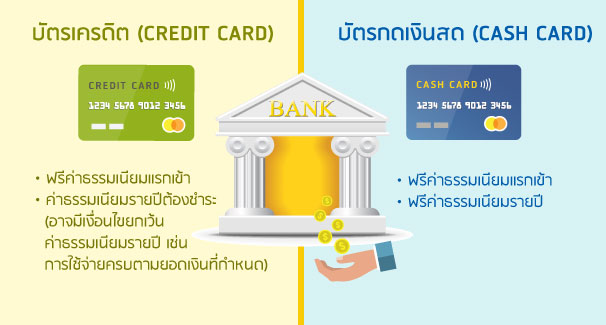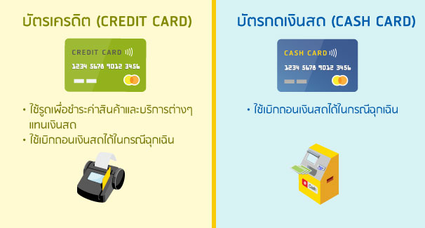 ทั้งนี้ แม้ว่าทั้งบัตรเครดิตและบัตรกดเงินสดจะสามารถเบิกถอนเงินสดได้เหมือนกัน แต่เมื่อเปรียบเทียบแล้วจะพบว่าการกดเงินสดจากบัตรเครดิตจะต้องเสียอัตราดอกเบี้ยและค่าธรรมเนียมแพงกว่าการกดจากบัตรกดเงินสดนะคะ (หากไม่จำเป็นจริงๆ ก็ขอแนะนำให้เลี่ยงการกดเงินสดจากบัตรเครดิตจะดีกว่า)