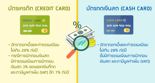 อ่านบทความเจาะลึกดอกเบี้ยค่าธรรมเนียมบัตรเครดิตได้ที่นี่) แต่หากเป็นกรณีการใช้บัตรกดเงินสดนั้นอัตราดอกเบี้ยและค่าธรรมเนียมจะถูกกำหนดไว้ไม่เกิน 28% ต่อปี (ไม่มีค่าธรรมเนียมการกดเงินสดเพิ่มอีก)