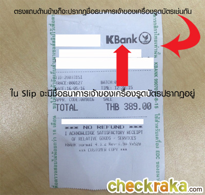 ตัวอย่าง Slip หลังจากทำการรูดบัตรเครดิตเพื่อชำระค่าสินค้าแล้ว จะมีชื่อธนาคารเจ้าของเครื่องรูดบัตรปรากฎอยู่บนตัวสลิป ทำให้เราทราบได้ว่าเครื่องรูดบัตรนั้นเป็นของธนาคารใด