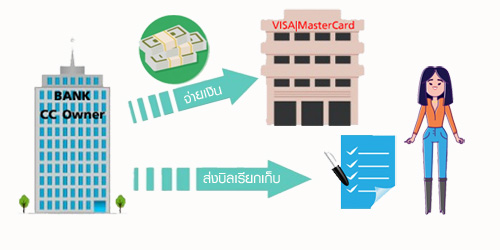 - Step 9 : สถาบันการเงินเจ้าของบัตรเครดิตจะจ่ายเงินให้กับบริษัทบัตรเครดิต (VISA, MasterCard) และส่งรายการใช้จ่ายทั้งหมด หรือที่เรียกว่าใบแจ้งยอดบัญชีบัตรเครดิตมายังผู้ถือบัตรฯ เพื่อทำการเรียกเก็บเงิน และรอการจ่ายต่อไป
