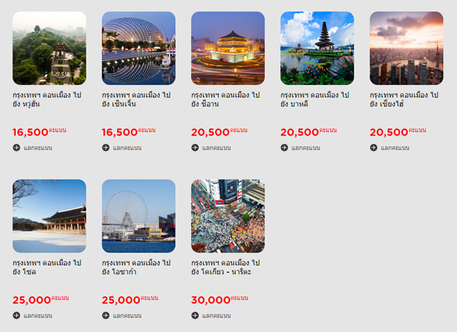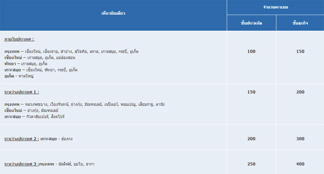 (หมายเหตุ : เป็นตารางแสดงจำนวนคะแนนสะสมที่ใช้ในการโดยสารเครื่องบินเที่ยวเดียว และอัตราการแลกคะแนนสะสมอยู่ที่ 1,500 : 10) ดูรายละเอียดเพิ่มเติมที่เว็บไซต์
