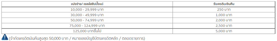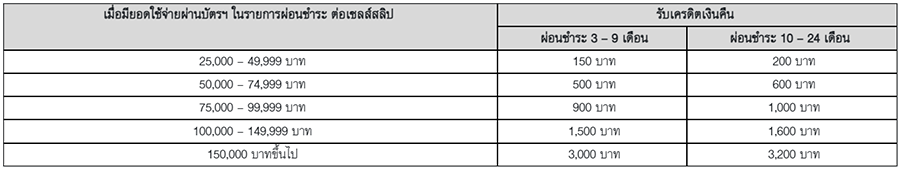 *สิทธิพิเศษสุดคุ้ม รับเครดิตเงินคืน 500 บาท เมื่อผ่อนตั้งแต่ 10 เดือนขึ้นไป ยอดผ่อนชำระตั้งแต่ 25,000 บาทขึ้นไป/เซลล์สลิป (จำกัดเครดิตเงินคืนสูงสุด 1,000 บาท / หมายเลขบัญชีบัตรหลัก / ตลอดรายการ)