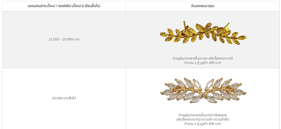 - เมื่อผ่อนชำระด้วยอัตราดอกเบี้ยพิเศษตั้งแต่ 30,000 บาทขึ้นไป/ เซลล์สลิปและตั้งแต่ 6 เดือนขึ้นไป รับของสมนาคุณต่างหูหุ้มทองลายใบมะกอก ฝังพลอย เสริมโชคลาภบารมี ความรัก ความสำเร็จ จำนวน 1 คู่ มูลค่า 899 บาท