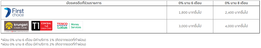 - ผ่อน 0% นาน 8 เดือน ตั้งแต่ 4,000 บาทขึ้นไป/เซลล์สลิป มีค่าบริการการผ่อนชำระ (Service charge) 2% (คิดจากยอดที่ทำผ่อน)