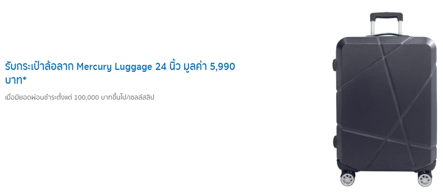 รับกระเป๋าล้อลาก Mercury Luggage 24 นิ้ว มูลค่า 5,990 บาท* เมื่อมียอดผ่อนชำระตั้งแต่ 100,000 บาทขึ้นไป/เซลล์สลิป *จำกัดการให้ของสมนาคุณ 1 ชิ้น/หมายเลขบัญชีบัตร/เดือน
