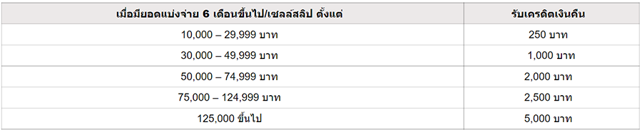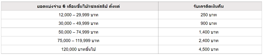- ยอดการแบ่งจ่ายแต่ละรายการไม่สามารถนำมาสะสมหรือรวมกันได้ โดยจะคำนวณเครดิตเงินคืนจากยอดแบ่งจ่าย 0% นาน 6 เดือน ขึ้นไป ตั้งแต่ 12,000 บาทขึ้นไป ต่อเซลล์สลิป