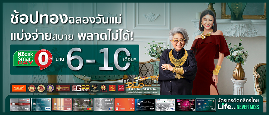 รายละเอียดโปรโมชั่น : Gold Festival ช้อปทองฉลองวันแม่ แบ่งจ่ายสบาย พลาดไม่ได้ เมื่อแบ่งจ่ายผ่าน KBank Smart Pay 0% นาน 6 ? 10 เดือน