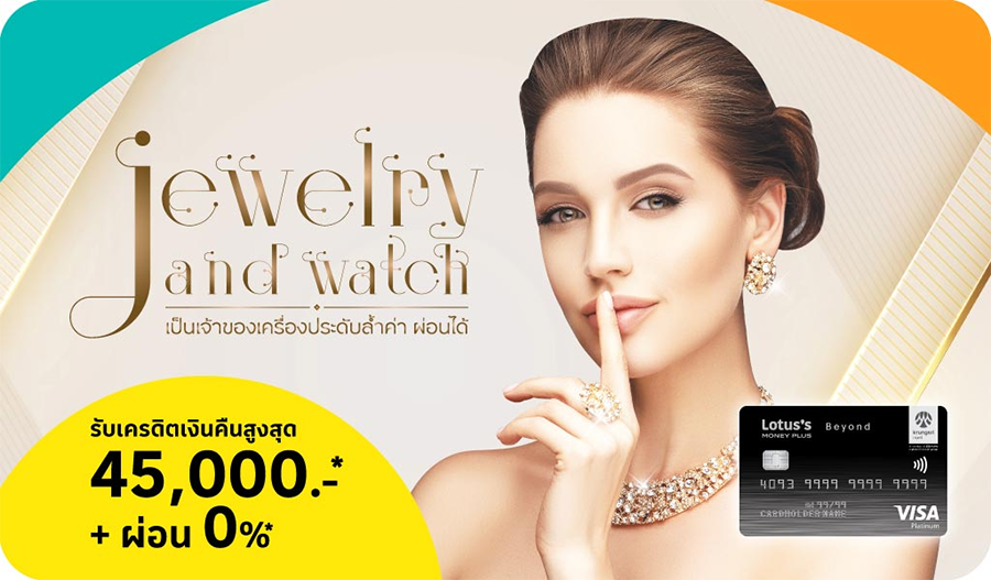 รายละเอียดโปรโมชั่น : Jewelry and Watch ผ่อนเครื่องประดับสุดคุ้ม 0% นาน 6 เดือนขึ้นไป ผ่อนแหวนเพชร สร้อยคอ กำไล จี้เพชร นาฬิกา พิเศษ! รับเครดิตเงินคืนสูงสุด 45,000 บาท* เมื่อผ่อนชำระตามเงื่อนไข