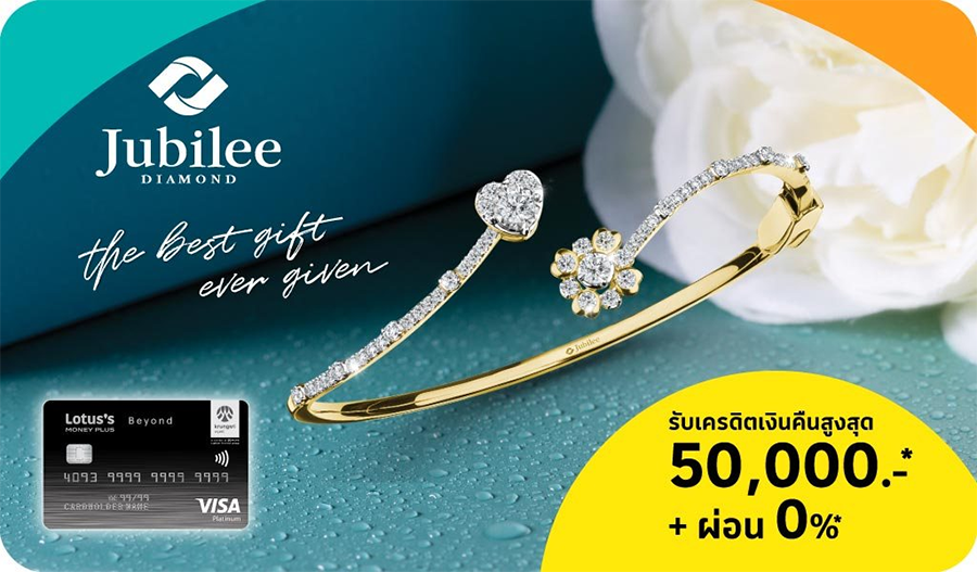 รายละเอียดโปรโมชั่น :Jubilee Diamond ผ่อน 0% นาน 6 เดือน ขึ้นไป รับเครดิตเงินคืนรวมสูงสุด 60,000 บาท ตลอดรายการ