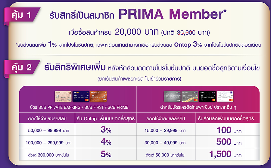 - คุ้ม 1 รับสิทธิ์เป็นสมาชิก PRIMA Member* เมื่อซื้อสินค้าครบ 20,000 บาท (ปกติ 30,000 บาท) *สิทธิพิเศษของ Member รับส่วนลดเพิ่ม 1% จากโปรโมชันปกติ, เฉพาะเดือนเกิดสามารถเลือกรับส่วนลด Ontop 3% จากโปรโมชันปกติตลอดเดือน