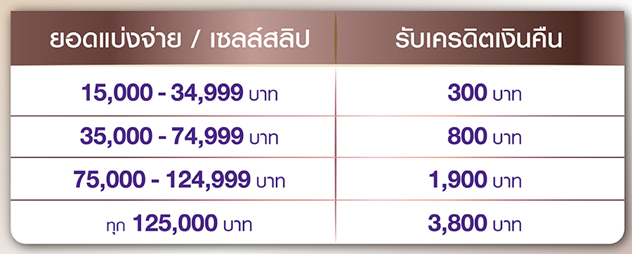 - รับเครดิตเงินคืน 2,625 บาท เมื่อมียอดผ่อนชำระ 75,000 - 119,999 บาท / เซลส์สลิป
