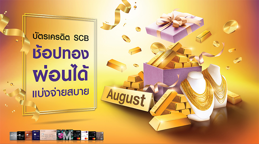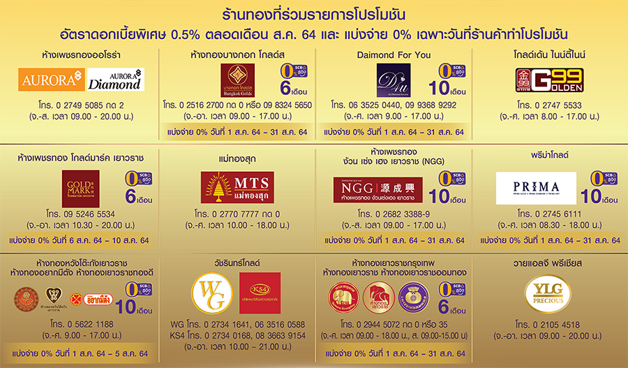 - สิทธิพิเศษนี้สำหรับผู้ถือบัตรเครดิตธนาคารไทยพาณิชย์ทุกประเภท ("ผู้ถือบัตร") เมื่อซื้อทองรูปพรรณ หรือเครื่องประดับเพชร พร้อมแบ่งจ่าย 0% ในวันที่ร้านค้าจัดโปรโมชันแบ่งจ่าย 0% และ 0.5% นานสูงสุด 10 เดือน ดอกเบี้ยพิเศษสำหรับลูกค้า ที่ห้างเพชรทองออโรร่า, ห้างทองบางกอก โกลด์ส, Diamond For You, โกลด์เด้น ไนน์ตี้ไนน์, ห้างเพชรทอง โกลด์มาร์ค เยาวราช,ห้างทองแม่ทองสุก, ห้างเพชรทองง้วนเซ่งเฮงเยาวราช (NGG), บริษัท พรีม่าโกลด์ อินเตอร์เนชั่นแนล จำกัด, ห้างทองหวังโต๊ะกังเยาวราช ห้างทองอยากมีตัง ห้างทองเยาวราชทองดี, ร้านวัชรินทร์โกลด์,ห้างทองเยาวราชกรุงเทพ ห้างทองเยาวราช ห้างทองเยาวราชออมทอง ที่ร่วมรายการ, บริษัท วายแอลจี พรีเชียส จำกัด ระหว่างวันที่ 1 ส.ค. 64 - 31 ส.ค. 64