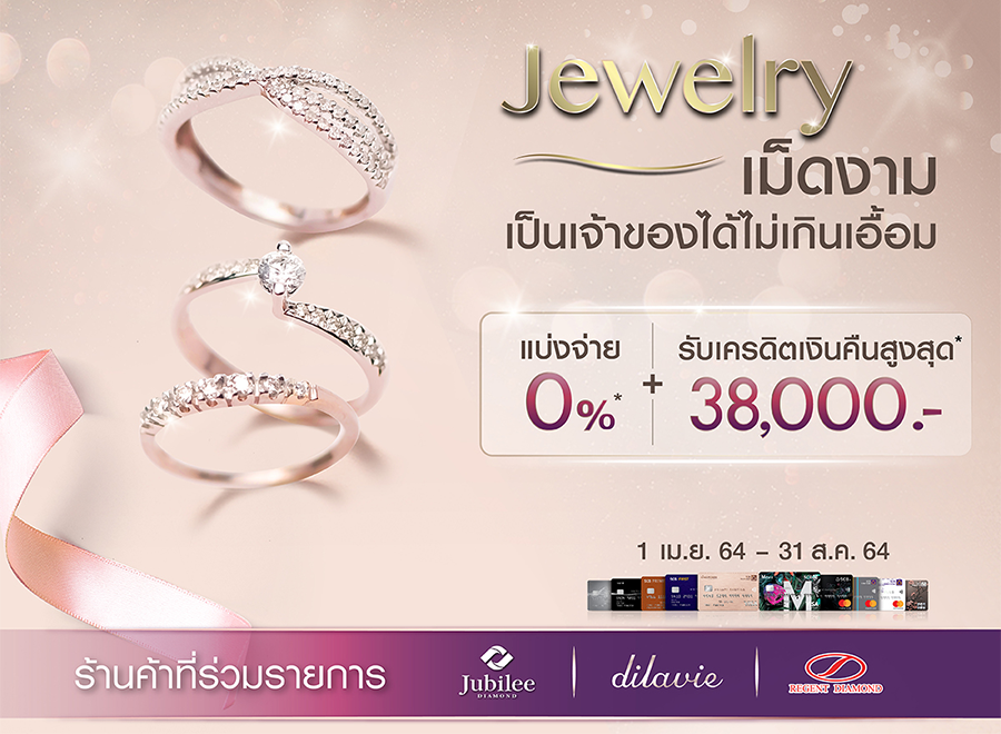 รายละเอียดโปรโมชั่น : สิทธิพิเศษสำหรับลูกค้าบัตรเครดิตไทยพาณิชย์ รับสิทธิ์แบ่งจ่าย 0% นาน 6 เดือน หรือ 10 เดือนพร้อมรับเครดิตเงินคืนสูงสุด 38,000 บาท ที่ร้านเพชร Jubilee / Dilavie / Regent Diamond เท่านั้น