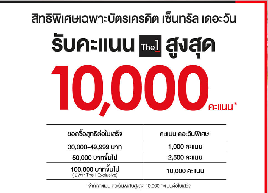 สมาชิกต้องใช้จ่ายผ่านบัตรเครดิตเซ็นทรัลเดอะวัน และแจ้งหมายเลขเดอะวันกับพนักงาน เพื่อรับคะแนนเดอะวันพิเศษภายใน 14 วัน หลังจบรายการ / เงื่อนไขการมอบคะแนนเดอะวันพิเศษ เป็นไปตามข้อกำหนดของ PRIMA และห้างฯ สอบถามรายละเอียดเพิ่มเติมที่จุดขาย