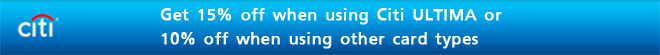 - ส่วนลด 15% สำหรับบัตรเครดิตซิตี้ อัลทิมา, ซิตี้ เพรสทีจ, ซิตี้ พรีเฟอร์ และ ซิตี้ ซีเล็ค