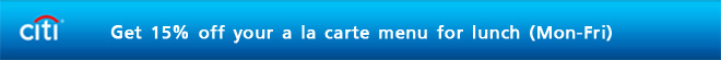 โปรโมชั่นสุดพิเศษจากบัตรเครดิตซิตี้ : รับส่วนลด 15% สำหรับเมนู A La Carte มื้ออาหารกลางวัน (จันทร์ - ศุกร์)