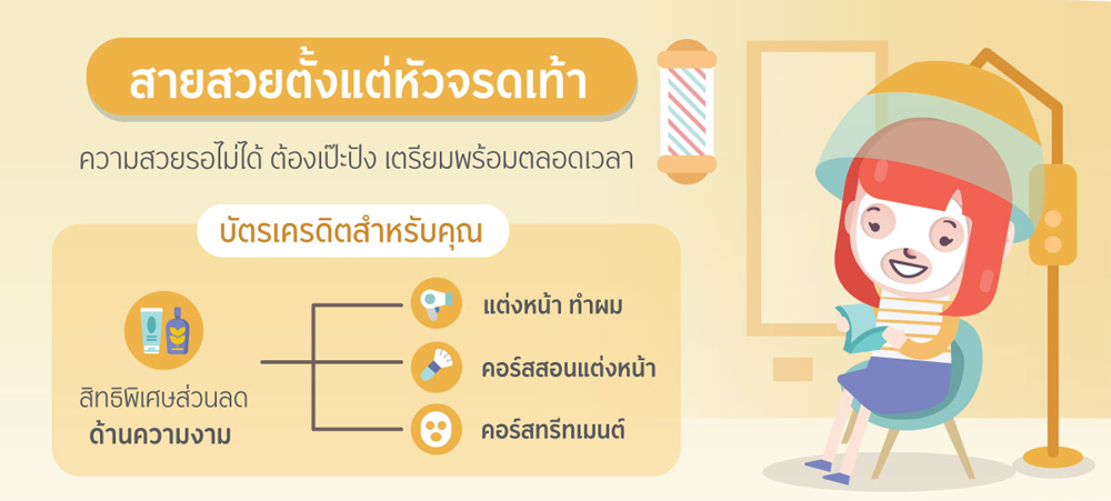 บัตรเครดิตที่ให้สิทธิประโยชน์ในเรื่องความสวยความงามเป็นเรื่องที่ช่วยให้สายสวยเป๊ะ สวยได้ในราคาที่น่าคบ เพราะบัตรเครดิตบางประเภท ช่วยให้คุณได้รับสิทธิพิเศษด้านความงามที่หลากหลาย เช่น ส่วนลดการแต่งหน้า ทำผม คอร์สทรีตเม้นท์ ณ สถานเสริมความงามต่างๆ นอกจากนี้บางบัตรฯ ยังให้สิทธิพิเศษในเดือนเกิด เช่น ได้รับบริการนวดบำรุงผิวหน้าฟรี หรือรับส่วนลดพิเศษสำหรับบริการด้านความงามจากแบรนด์ชั้นนำ หรือแม้กระทั่งการผ่อน 0% เมื่อซื้อคอร์สทรีตเม้นท์อีกด้วย