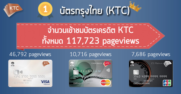 อันดับ 1 และมีจำนวนคนเข้าดูข้อมูลบัตรเครดิตเพิ่มขึ้นเรื่อยๆ ทุกปี ในปีนี้มียอด pageviews สูงถึง 117,723 pageviews และ 3 อันดับบัตรเครดิต KTC ที่มีคนเข้ามาดูมากที่สุด ได้แก่