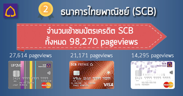 บัตรเครดิตไทยพาณิชย์ (SCB Credit Card) แต่มีจำนวนคนเข้าดูข้อมูลบัตรเครดิตเพิ่มขึ้นถึง 98,270 pageviews และ 3 อันดับบัตรเครดิต SCB ที่มีคนเข้าดูมากที่สุด ได้แก่