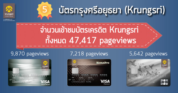 บัตรเครดิตกรุงศรี (Krungsri Credit Card) ที่ขยับขึ้นมาจากอันดับที่ 7 ของปีที่แล้ว มีจำนวนคนเข้าดูข้อมูลบัตรเครดิตทั้งหมด 47,417 pageviews และ 3 อันดับบัตรเครดิตกรุงศรี ที่มีคนเข้าดูมากที่สุด ได้แก่