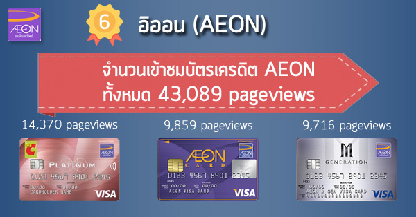 บัตรเครดิตอิออน (AEON Credit Card) มีจำนวนคนเข้าดูข้อมูลบัตรเครดิตทั้งหมด 43,089 pageviews และ 3 อันดับบัตรเครดิต AEON ที่มีคนเข้าดูมากที่สุด ได้แก่