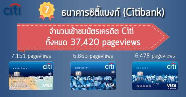บัตรเครดิตซิตี้ (Citi Credit Card) มีจำนวนคนเข้าดูข้อมูลบัตรเครดิตทั้งหมด 37,420 pageviews และ 3 อันดับบัตรเครดิต Citi ที่มีคนเข้าดูมากที่สุด ได้แก่