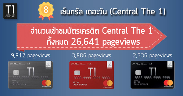 บัตรเครดิตเซ็นทรัล เดอะวัน (Central The 1 Credit Card) ที่มีจำนวนคนเข้าดูข้อมูลบัตรเครดิตทั้งหมด 26,641 pageviews และ 3 อันดับบัตรเครดิต Central The 1 ที่มีคนเข้าดูมากที่สุด ได้แก่