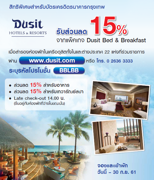 รายละเอียดโปรโมชั่น : รับส่วนลด 15% จากแพ็กเกจ Dusit Bed & Breakfast เมื่อสำรองห้องพักในเครือดุสิต ทั้งในและต่างประเทศ 22 แห่งที่ร่วมรายการ ผ่าน
