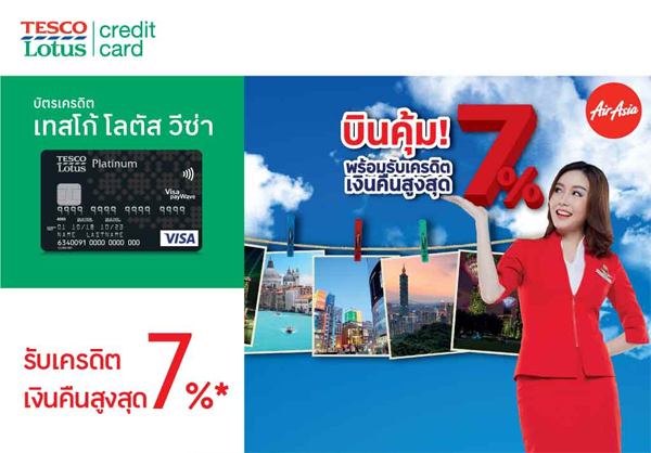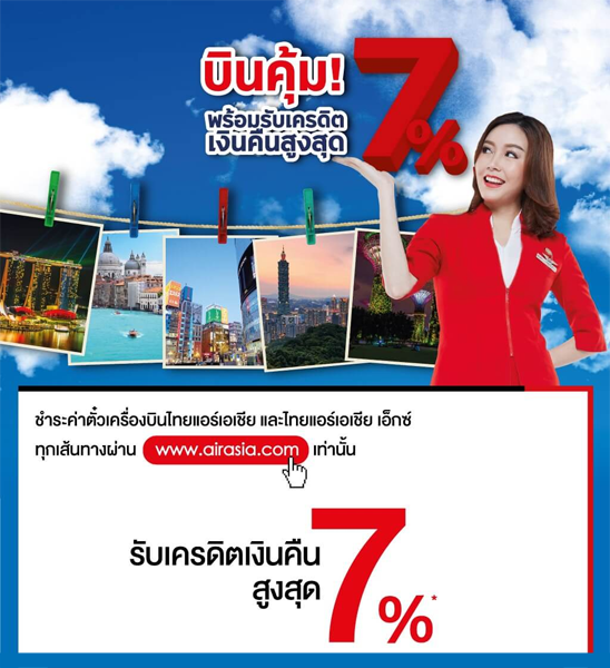 รายละเอียดโปรโมชั่น : บินเที่ยวแบบสุดคุ้มกับ AirAsia รับเครดิตเงินคืนสูงสุด 7% เมื่อชำระค่าตั๋วเครื่องบินไทยแอร์เอเชีย และไทยแอร์เอเซีย เอ็กซ์ ทุกเส้นทาง ผ่าน