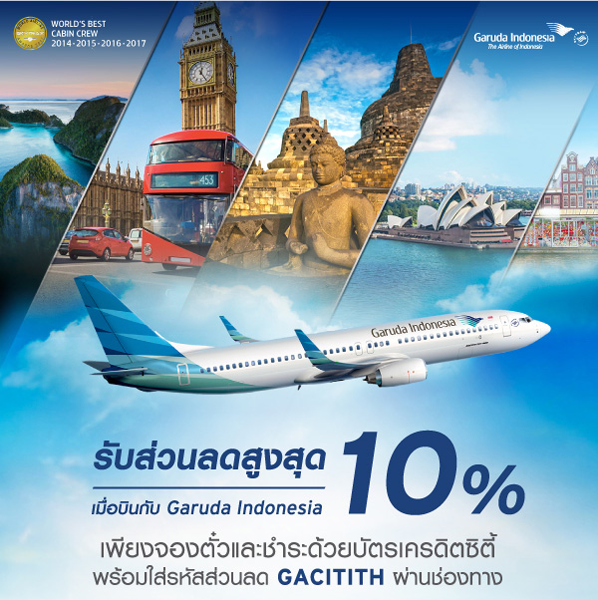 รายละเอียดโปรโมชั่น : รับส่วนลดสูงสุด 10% เมื่อบินกับ Garuda Indonesia เพียงจองตั๋วและชำระด้วยบัตรเครดิตซิตี้ ผ่านทาง