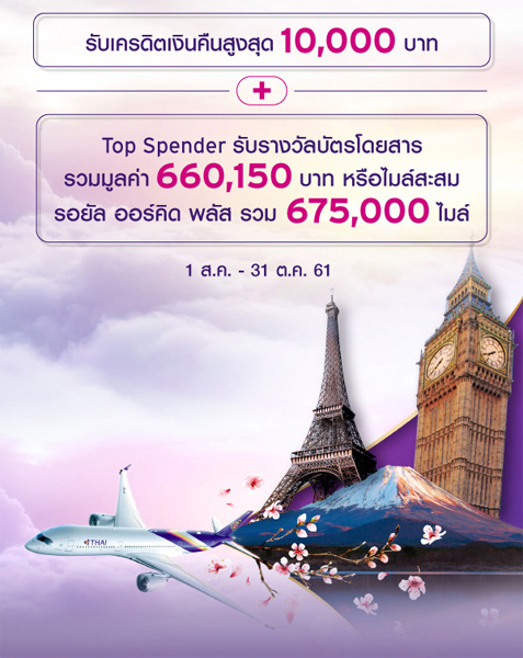www.thaiairways.com - Top Spender รับรางวัลบัตรโดยสาร รวมมูลค่า 660,150 บาท หรือไมล์สะสม รอยัล ออร์คิด พลัส รวม 675,000 ไมล์