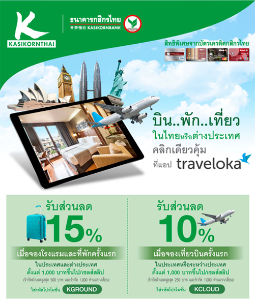 www.traveloka.com/kbank - รับส่วนลด 15% เมื่อจองโรงแรมและที่พักครั้งแรก ตั้งแต่ 1,000 บาทขึ้นไป/ เซลล์สลิป